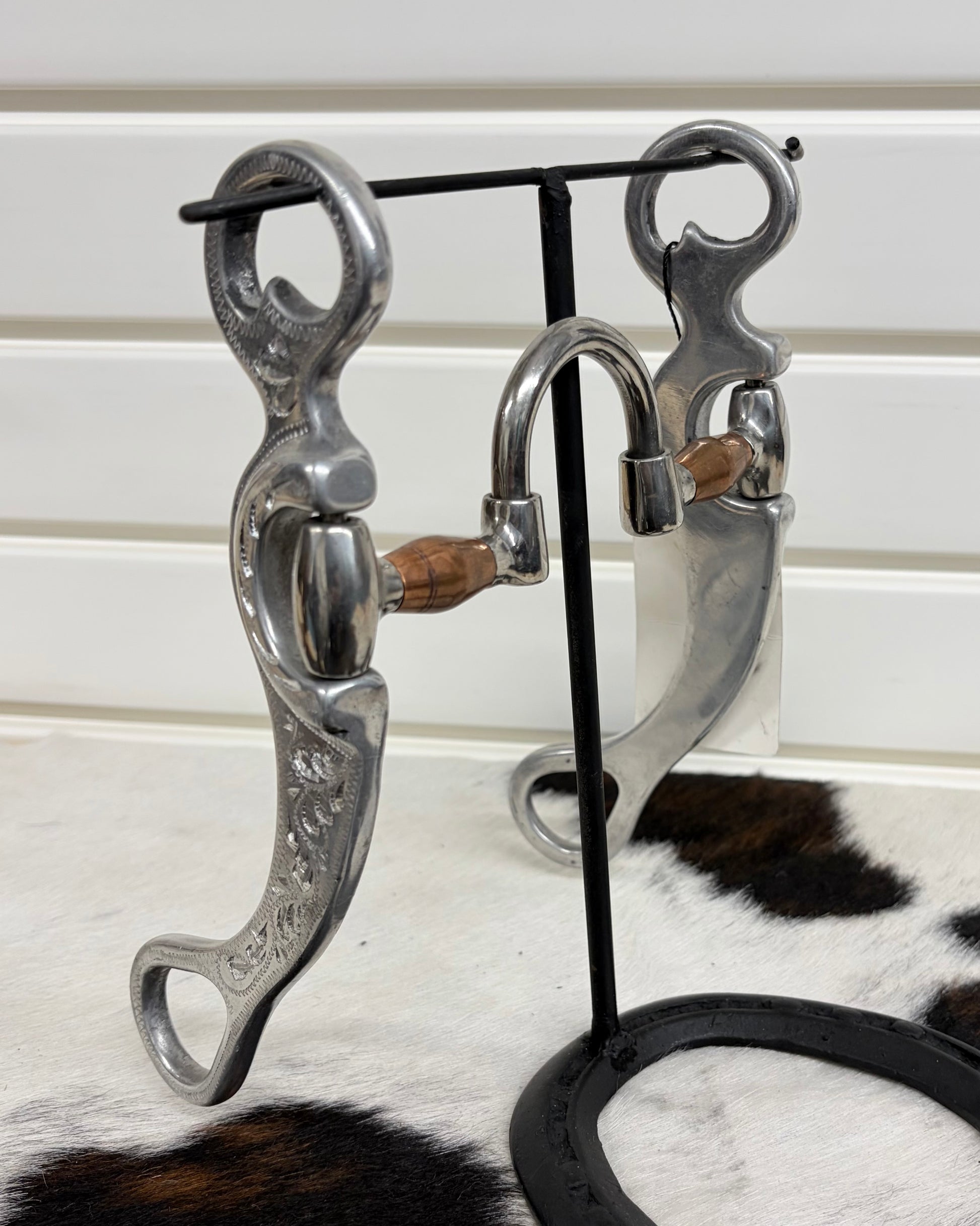 This Aluminum Correction Bit with Copper Rollers is a lightweight bit making it versatile for many horses and riders. The stainless steel port and copper rollers encourage salivation while the engraved aluminum swivel cheeks ensure balance and comfort. It has a 5" mouthpiece, 7 3/4" shank, and 1 5/8" port.