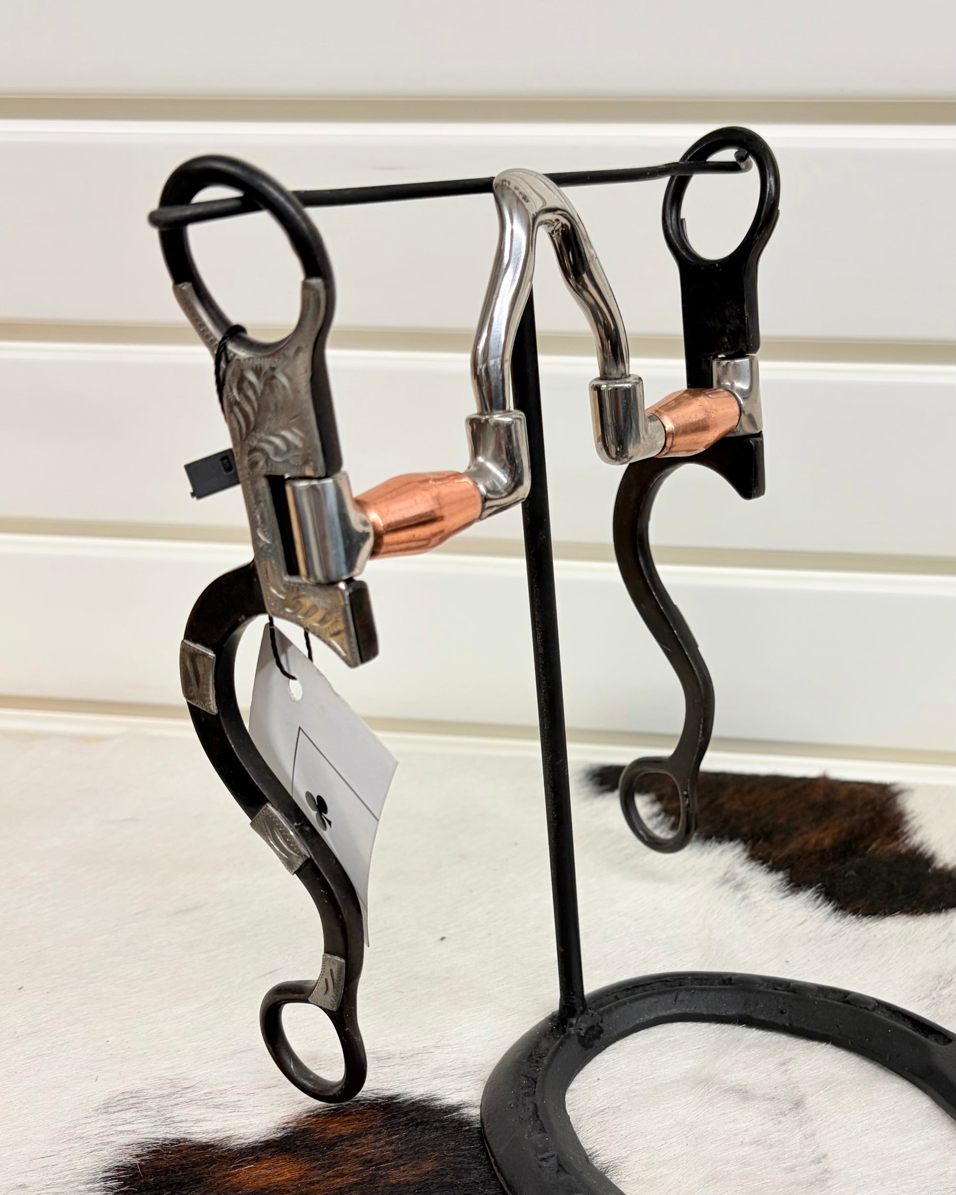 This Antique Finish Cathedral Bit has swivel shanks to allow the rider to individually work both sides of the horse's mouth. The mouthpiece measures 5" with a 2 1/2" port and 7 1/2" shanks.
